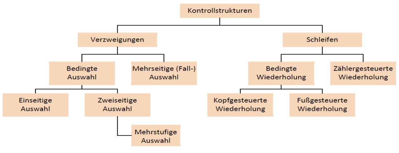 Kontrollstrukturen bestehen aus zwei Kategorien: Verzweigungen (z.B. if-then-else) und Schleifen (z.B. while). Bei Verzweigungen geht es prinzipiell darum, ob eine Anweisung oder ein Block von Anweisungen ausgeführt werden soll oder nicht. Bei Schleifen geht es darum, dass eine Anweisung oder ein Block von Anweisungen unter Umständen mehrmals ausgeführt werden soll.